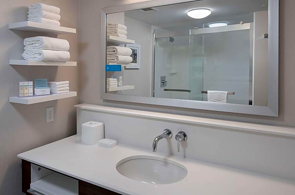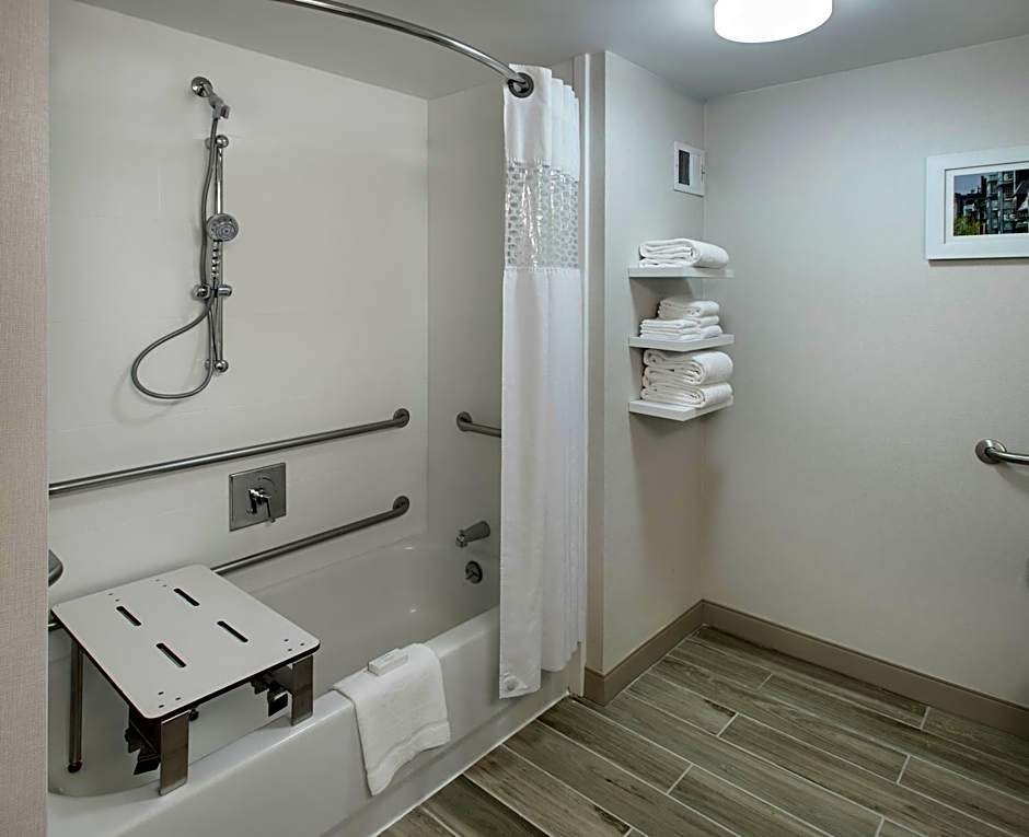 This mobility and hearing accessible, nonsmoking room features two double sized beds , and an accessible bath tub.